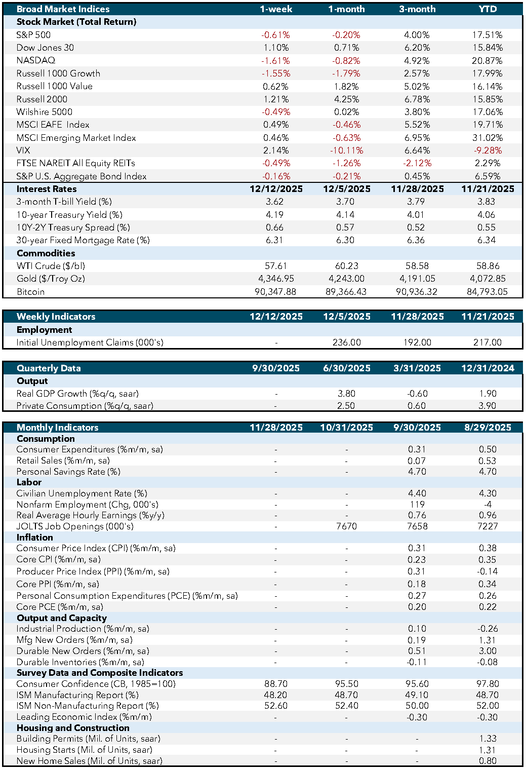 The Job Openings and Labor Turnover Survey (JOLTS) report, released Tuesday for October, showed job openings steady at 7.7 million, holding at a 4.6% rate. The Federal Reserve’s Wednesday decision saw the Federal Open Market Committee (FOMC) vote to cut the policy rate by 25 basis points, bringing the federal funds target range to 3.50-3.75%. The Fed acknowledged slowing job growth and persistent inflation, signaling vigilance ahead. Chair Powell emphasized data dependence, while the “dot plot” suggested only one more rate cut in 2026.