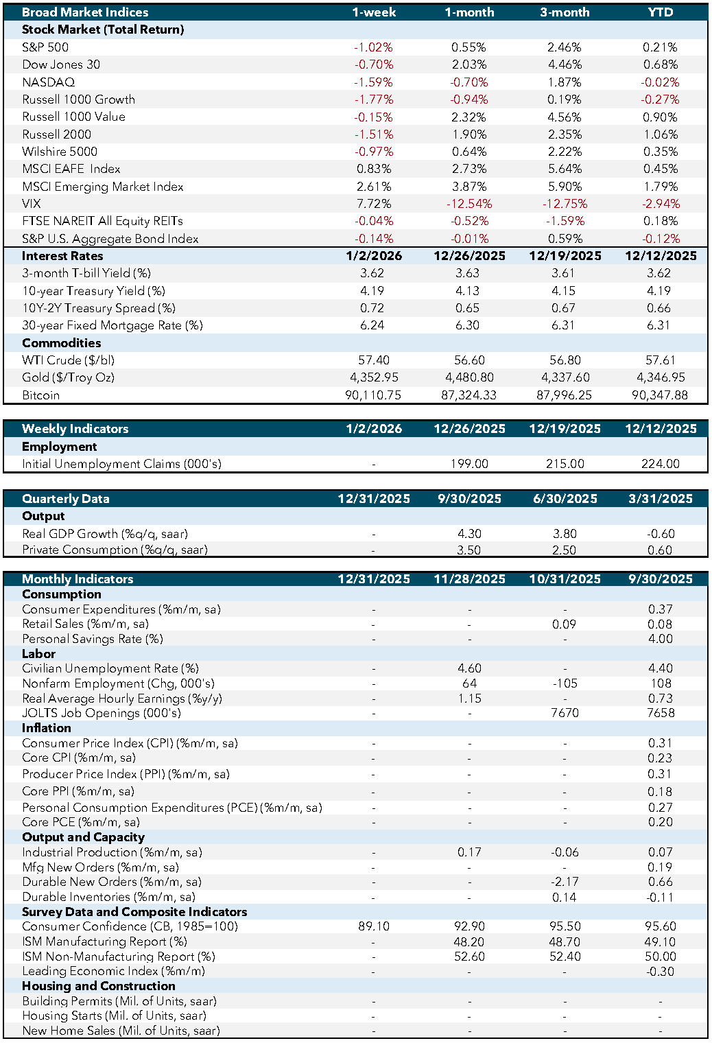 Manufacturing activity softened to finish the year. The S&P Global U.S. Manufacturing Purchasing Managers’ Index (PMI) finalized at 51.8 for December, down from 52.2 in November, indicating slower expansion and easing price pressures. Softer new orders and reduced selling-price inflation point to a disinflationary tilt in goods, aligning with cautious capital spending trends.